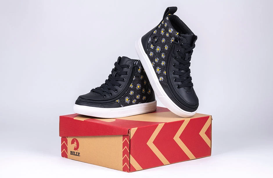 Bringing a bouquet of happiness to every step, the Black Daisy BILLY Classic Lace High Tops are sure to deliver. Built around the BILLY Classic High Top silhouette, these fun kicks come with functional laces for a custom fit, removable insoles for added depth if need be, and the wraparound zipper for unmatched convenience. Your kiddos are going to love stepping into these daisy delights. Enjoy!