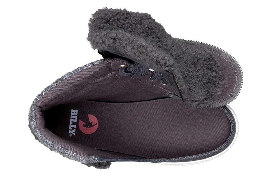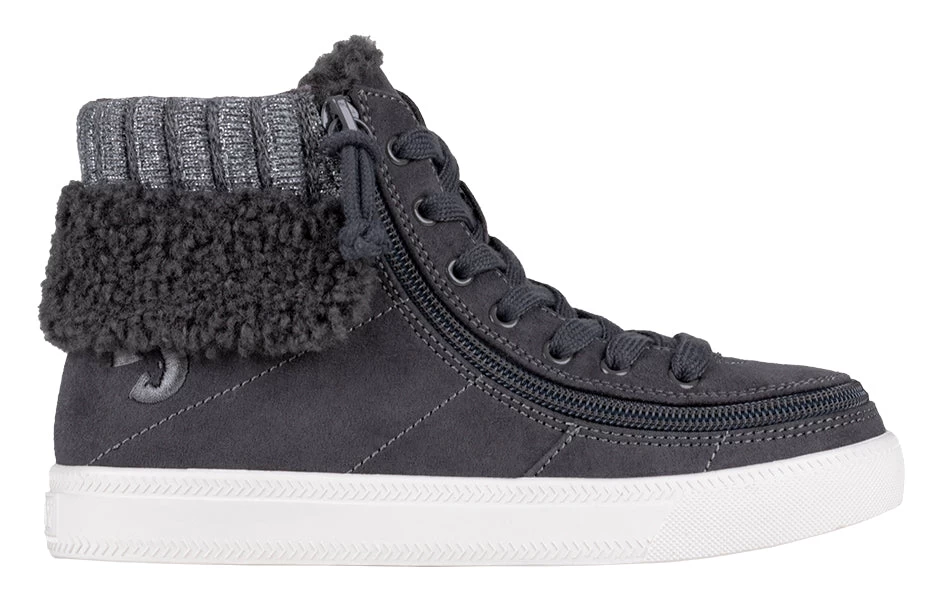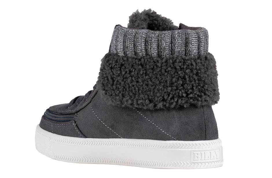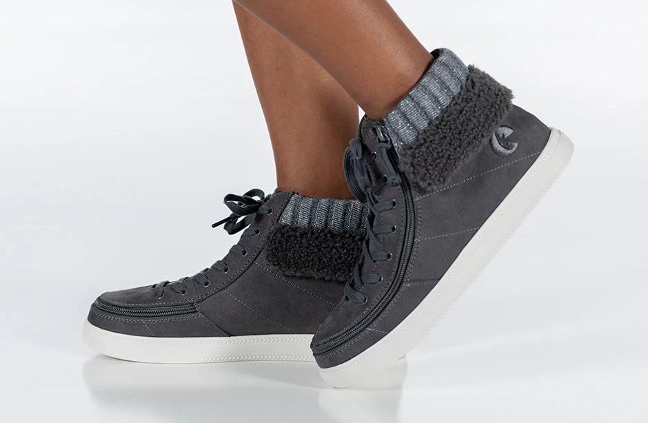 A trendy look to the Classic High Top, the Charcoal Grey BILLY Cuffs are sure to receive compliments. Combining fashion with function, Step In! unobstructed in seconds. These flannel and faux suede kicks have a soft feel and fur collar for extra comfort. Use the functional laces to get the fit right, and then use the wraparound zipper henceforth. Enjoy!