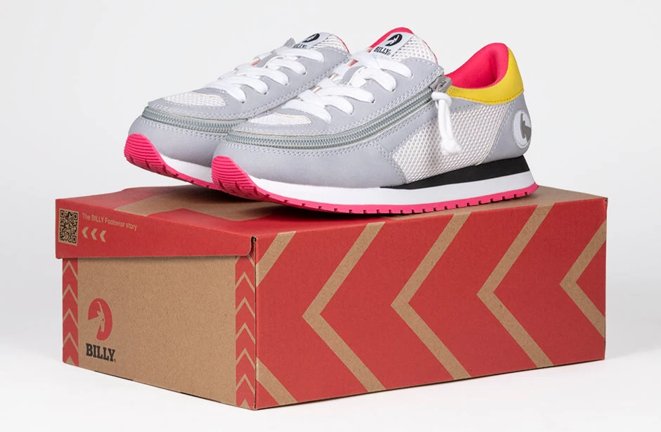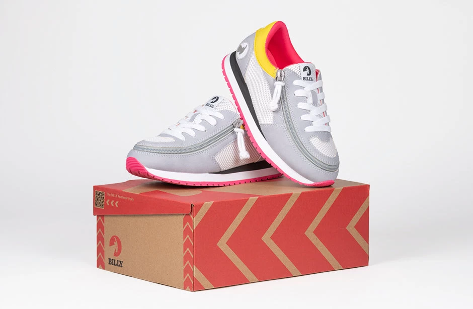 No matter how you get around, you will be moving with style in these Grey/Pink BILLY Joggers. Our joggers have a comfortable insole, and incorporate our innovative full-wrap zipper that makes them easy to put on, and wear all day.